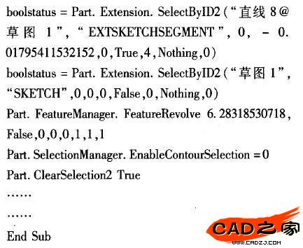 對于程序代碼的編寫,簡單實用的方法是先錄制使用Solidworks用戶界面執行的操作,即錄制宏,獲得宏操作代碼,將其復制添加到程序中"創建"控件的click事件下,然后在代碼中找到定義實體模型的尺寸值,用對應的尺寸參數代替這些尺寸值。編輯修改以達到程序要求,通過程序驅動設計變量實現模型的建立和更新,這種方法編程較簡單,通用性好。具體代碼如下: