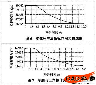 圖4、圖6,圖7的仿真結(jié)果對支撐桿、三角板、液壓機構(gòu)的強度設(shè)計及對車廂地板的結(jié)構(gòu)設(shè)計提供了數(shù)值依據(jù)。