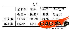 網格剖分后,裝配體網格模型的節點數為31776;單元數為16352。零件模型網格剖分后的結果是節點數為29269,單元數為14799。如圖1、圖2所示。表2是網格模型剖分結果的對比。