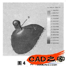 在圖3上,可以清晰地看到A處是應(yīng)力集中最大處,在焊接時(shí),應(yīng)加強(qiáng)對(duì)此處的處理。此種齒座雖然不容易造成齒座干涉,但是應(yīng)力集中也最嚴(yán)重,不利于齒座的焊接。設(shè)計(jì)了幾種不同形制的齒座分別進(jìn)行了有限元分析,如圖4所示,發(fā)現(xiàn)增加B,G面與截割頭面的交角,增大B,C面之間的圓弧,能夠有效降低應(yīng)力集中及應(yīng)力,減小焊高,降低焊接時(shí)的應(yīng)力集中現(xiàn)象。但是過大的交角勢必增加齒座的尺寸,容易造成齒座干涉,設(shè)計(jì)時(shí)應(yīng)當(dāng)根據(jù)截割頭的形狀具體確定。
