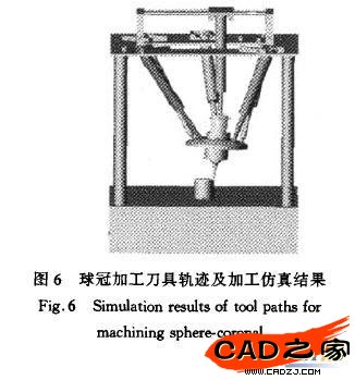 通過并聯機床運動仿真系統操作界面可以完成對加工所用刀具的定義、加工所用刀柄的定義、加工毛坯的定義、仿真NC文件的選擇、刀具軌跡的顯示驗證、加工控制(刀具回零、運動仿真、暫停、恢復斷點、停止仿真),并且具有數據顯示(刀尖點位置坐標顯示、刀具姿態顯示、驅動桿長度顯示)、仿真進度顯示、仿真所用刀具信息顯示等功能。球冠加工刀具軌跡及加工仿真如圖6所示。