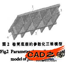 在此窗口內輸人所有參數,并選擇繪圖.將生成符合用戶需求的新的卷筒底座三維模型,同時還可根據用戶需要自動生成其二維工程圖,加速產品的設計速度。卷筒底座的參數化三維模型見圖2。