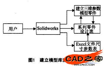 在建立某種形體庫時,首先建立該形體的基本的實體形狀,之后建立系列零件的參數表,庫中的每個模型由三維參數化模型和系列零件設計表組成。三維參數化模型是利用特征造型技術建立的,建立的實體模型便是該庫中存儲的默認實體模型,而各類由系列模型的設計則是由零件系列表的尺寸驅動。