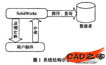 SolidWorks是基于Windows的全參數化特征造型軟件,為用戶提供了Windows對象鏈接嵌入(OLE Automation)和部件對象模式(COM)的應用程序接口,以及豐富的API接口函數和完整的消息事件機制,可以方便的使用C++或VB對軟件進行二次開發,生成可執行文件或插件。在這里選用VB配合為SolidWorks開發插件的方式來實現軟件功能。系統結構示意圖如圖1所示。