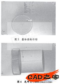 2)選擇上一步生成的齒輪,利用陣列功能,設(shè)置陣列中心、數(shù)目參數(shù),生成整體齒輪;選擇基準面,繪制草圖,利用旋轉(zhuǎn)拉伸功能生成異形零件尾部實體;見圖3-4.