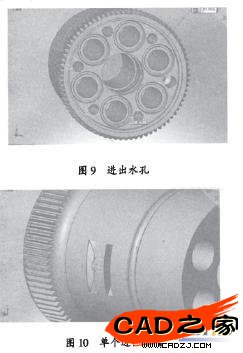 5)選擇基準面,繪制草圖,利用拉伸切除和陣列功能生成進出水孔;選擇基準面,繪制草圖,利用拉伸切除和陣列功能生成進出水槽;見圖9-l0.