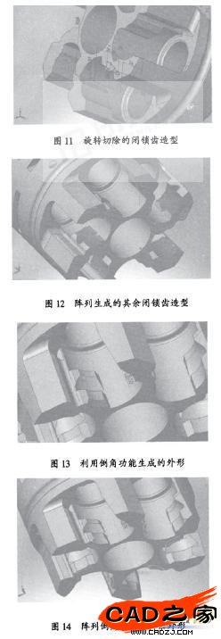 6)選擇基準面,繪制草圖,利用拉伸切除、旋轉(zhuǎn)切除、倒角和陣列等功能生成異形零件尾部閉鎖齒部位,見圖11。