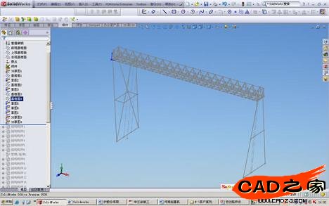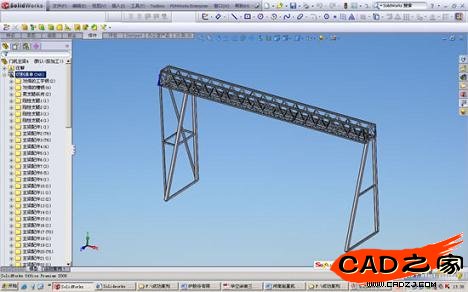 傳統(tǒng)的設計軟件都是直接從二維草圖開始,三維草圖效果差,實現(xiàn)困難。而桁架起重機需要的恰恰就是3D結構,以便于結構件的生成。現(xiàn)在solidworks三維設計可以直接從3D草圖開始繪制,像桁架門式起重機的骨架就可以直接搭建。而且可以3D草圖與2D草圖可以相互交替使用。搭建好的3D草圖如下圖所示: