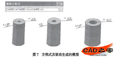 (3)方程式中可以使用條件語句,語法格式為:"Dx@SketchY"=if((條件),參數1,參數2)。當式中條件成立時,取值為參數l,否則取值為參數20針對圖6所示圓凹模。凹模刃口尺寸為d,外徑隨d變化且取整數,可利用公式進行參數化建庫。方法是:先建立圓凹模零件,然后插入公式,改變d值,D。自動變化。