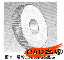 對單個輪齒以蝸輪基體特征的軸線進行圓周陣列生成全部輪齒,最后再調(diào)用API中的相關(guān)函數(shù)進行蝸輪的圓角處理即可得到蝸桿傳動中的蝸輪三維造型,見圖2。蝸桿傳動中的蝸桿三維造型用類似的方法可以得到,見圖3。