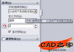 四、定義【選項】中的【方向/扭轉控制】為"以法向不變沿路徑扭曲"設置旋轉次數(shù)為6。