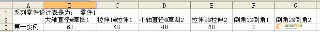 在成功輸入基本零件各尺寸后,接著就要輸入其它各相似軸的尺寸參數,以第一實例輸入的格式,各參數對號入座。完成并保存后零件配置欄出現系列零件圖標。如下圖所示