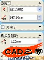 18 方向1群組的深度值設(shè)為147.6mm,確認鈑金參數(shù)群組的厚度值設(shè)為1.2mm之后一邊確認預(yù)覽,一邊把反向復(fù)選框設(shè)為ON/OFF讓板厚的斷面圖向內(nèi)。折彎半徑值設(shè)為1.2mm。