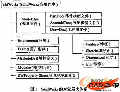 SolidWorks API為用戶提供了完全面向?qū)ο蟮念愺w系,是一個(gè)自上而下的多層次的樹型網(wǎng)絡(luò)結(jié)構(gòu),其部分組織結(jié)構(gòu)關(guān)系如圖l所示。它包括對象的類型、屬性和方法。SldWorks是根目錄對象類,位于應(yīng)用程序的底層,是訪問SolidWorks API所有對象的入口。開發(fā)者通過操縱對象的屬性和調(diào)用對象的方法建立自己的應(yīng)用程序。