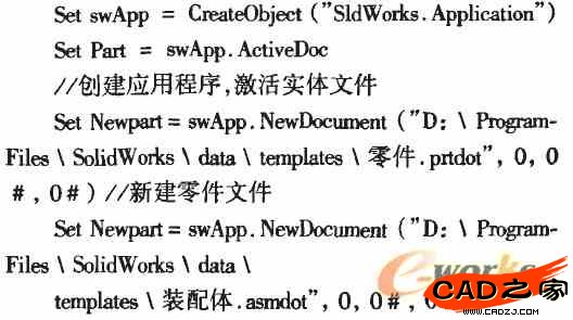 3.2.2 零件、裝配文檔的創(chuàng)建SldWorks對象是SolidWorks API中最高級(jí)的對象,它提供了SolidWorksAPI中所有對象的直接或間接接口。通過該對象可以控制SolidWorks軟件的執(zhí)行或退出。在VB中利用Create Object方法來獲得Sldworks對象,利用該對象的activedoc方法可以獲得當(dāng)前Solidworks文件對象。