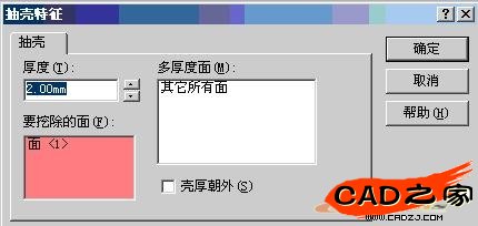 下一步,你做零件的抽殼。從選中的平面通過移走材料來抽空零件,留下一層薄壁的零件。