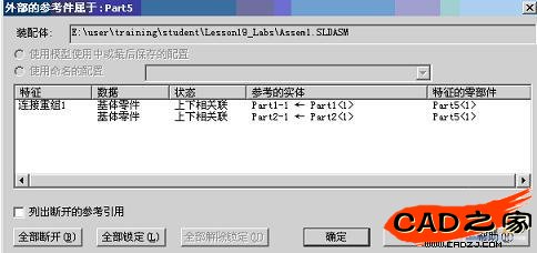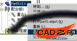 注意: 只有當(dāng)項(xiàng)目有外部參考引用,即名稱后跟有的 -> 時(shí),此操作才能使用。本例中,part5<1>后面右一個(gè)"->"符號(hào),圖中不清楚