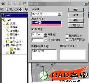 2、刪除其中一個(gè)元件:雙擊陣列(設(shè)計(jì)樹(shù)中)----選擇其中一個(gè)元素(注意一定要選中實(shí)例,不要選擇實(shí)例的邊線,可以選擇面)---按下DEL鍵--出現(xiàn)右圖對(duì)話框。,注意對(duì)話框中的"刪除陣列實(shí)例",刪除的實(shí)例中有(4),表示第4個(gè)實(shí)例被刪除。按確定