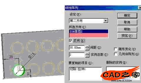 線性陣列:將一個(gè)具有一個(gè)或兩個(gè)尺寸定位的特征沿尺寸方向建立若干特征。