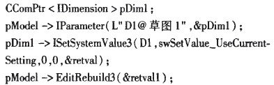 首先定義一個(gè)尺寸類指針,然后將尺寸變量放到指針中,使用Dimension::SetSystemValue3將變量賦值修改,最后使用ModelDoc2::EditRebuild3重建模型,完成尺寸驅(qū)動(dòng)建模過程。