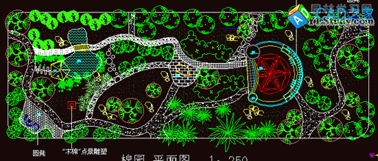 1.棉園東側的廣場地面鋪裝成木棉花式的圖案,與園中的木棉相呼應。廣場的鋪裝可舉行舞會,滿足晨練、散步活動的需要。廣場東側弧形花架,讓游人視線向廣場內聚,突出廣場的重要性,以形成一個控制點。.廣場西側兩邊設花壇以增加空間的吸引力。廣場周圍植若干樹大蔭濃的庭院樹,圍合成半通透的安靜空間,在樹下安放桌凳,方便游人休憩娛樂。