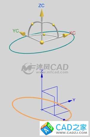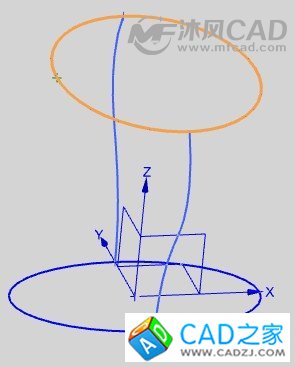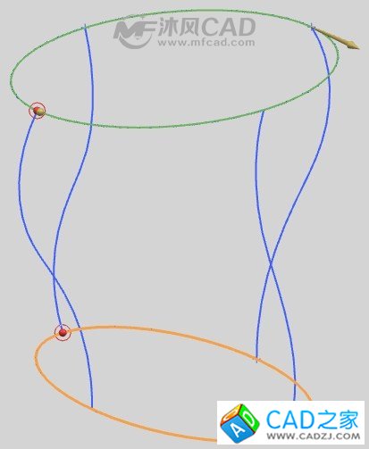 十、然后使用【通過曲線網格】命令,選擇上下兩個橢圓為主曲線,在使用通過曲線網格命令的時候主曲線與交叉曲線分別必須是同方向與起點皆相同,如圖所示兩個主曲線的起點是不相同的。