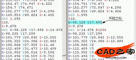如圖一所示的那樣,這條直線將導致工件的過切,也造成刀具被撞壞,更嚴重的可能會造成工件報廢、機床受損等,所以必須在后處理文件的定義上多加小心,尤其是一些精度的定義或是范圍的界定,稍有不當將會造成很大的損失!我們比較兩個NC程式會發現問題的所在: