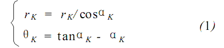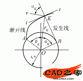 當(dāng)直線發(fā)生域沿一個(gè)圓的圓周作純滾動(dòng)時(shí) ,直線上任意一點(diǎn) K的軌跡AK稱為該圓的漸開線,簡(jiǎn)稱漸開線。點(diǎn) A 為漸開線在基圓上的起點(diǎn), K為漸開線上任意一點(diǎn),其向徑用 r K表示,漸開線 A K 段的展角用θK 表示,基圓半徑為r K。法線 B K與點(diǎn) K速度方向線之間所夾得銳角稱為齒廓在該點(diǎn)壓力角,記為αK。 根據(jù)漸開線的性質(zhì) ,得到漸開線的極坐標(biāo)參數(shù)方程式為: