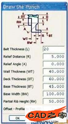打開(kāi)文件,在建模狀態(tài)下選擇沖模設(shè)計(jì)模塊中的拉延凸模工具,彈出圖1所示的拉延凸模設(shè)計(jì)菜單。根據(jù)菜單提示依次選擇凸模輪廓、底面基準(zhǔn)、數(shù)模面以及坐標(biāo),并對(duì)相關(guān)參數(shù)進(jìn)行設(shè)置(圖2);選擇筋板設(shè)置相關(guān)參數(shù),按確認(rèn)生成拉延凸模(圖3)。
