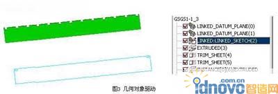 幾何對象驅動技術就是將幾何對象聯(lián)接到其它零部件,使父部件與裝配中的其它組件中的幾何對象相關聯(lián)。當改變父部件中定義的幾何對象時,則抽取該幾何對象的所有部件中的對應幾何對象會自動更新,從而實現(xiàn)部件間幾何形狀的自上而下的控制。例如從格柵部件聯(lián)接來的定距板外形輪廓,如圖3所示。
