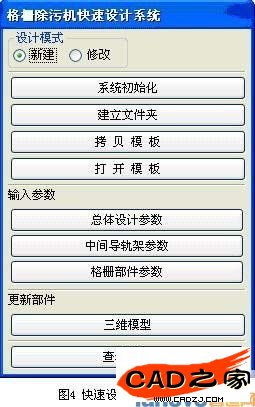 用戶界面主要是提供設計人員輸入設計參數(shù)以完成設計的接口,UGⅢ提供了可視化的對話框編成環(huán)境,用戶可以根據(jù)產(chǎn)品設計要求方便地定制設計界面,大大縮短了產(chǎn)品設計系統(tǒng)的開發(fā)周期。圖4和圖5分別為快速設計系統(tǒng)的設計界面及格柵除污機的三維數(shù)字化模型。