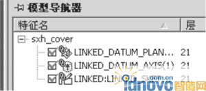 曲軸箱蓋和缸頭蓋等零件使用UG-WAVE技術,分別基于曲軸箱和缸體的幾何和位置關系創建而成。如曲軸箱蓋sxh_cover的創建,先把曲軸箱零件sxh_crankcase中的輪廓草圖和參考基準鏈接到sxh_cover零件中,以鏈接過來的基準為基準創建草圖,并建立和鏈接草圖的幾何約束關系,如圖5所示。這樣就在曲軸箱和蓋之間建立了相關性,當曲軸箱更改時,蓋也將作相應更新。