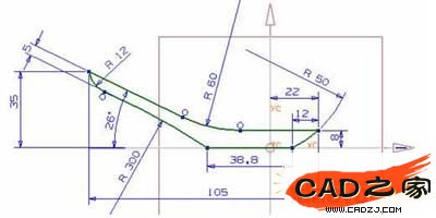 如圖9所示草圖,點1是新構建的點(通過做點命令,由基面與曲線的交點捕捉),將R50的圓弧約束在該點上,點2也是新構建的點(通過做點命令,由基面與曲線的交點捕捉),將底部的圓弧約束在該交點上