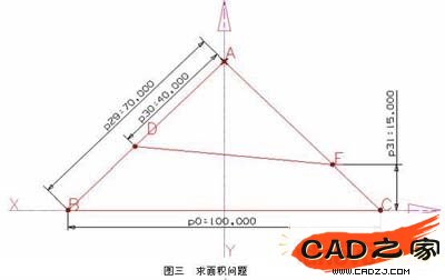 由圖七可以看出當_p31這個尺寸在4.9到6.85之間變化時三角形ADE和四邊形DECB的面積的差值由正轉負,也就是說當_p31這個尺寸取4.9到6.85之間某個值時三角形ADE和四邊形DECB的面積的差值為零,即三角形ADE和四邊形DECB的面積相等。