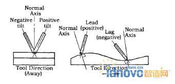 多軸銑在給葉片型面加工帶來很多優(yōu)點(diǎn)的同時(shí),也帶來了許多應(yīng)用上的復(fù)雜性。首先是多軸算法相比3軸算法對(duì)被加工曲面的質(zhì)量提出了更高的要求。曲面局部的不光順及相鄰曲面的非光滑連接,不僅會(huì)在由驅(qū)動(dòng)點(diǎn)投影生成刀觸點(diǎn)時(shí)出現(xiàn)交叉或重疊,同時(shí)也會(huì)在形成刀軸矢量時(shí)產(chǎn)生突變,生成不合理的刀具軌跡。其次是刀具運(yùn)動(dòng)參數(shù)設(shè)置的復(fù)雜性。為了改善刀具的切削狀態(tài),多軸加工中的刀軸矢量必須根據(jù)被加工曲面的形狀變化而變化。在計(jì)算刀具軌跡時(shí),刀軸矢量一般通過定義刀具與曲面的前傾角(1ead angle)和側(cè)傾角(tilt angle)來設(shè)定,如圖2所示。由于前傾角和側(cè)傾角均可在一個(gè)合理的取值范圍內(nèi)變化,如何在不同的位置設(shè)置不同的傾角,使刀具在具有良好的切削狀態(tài)的前提下,盡可能地采用不同的位置參與切削來提高刀具的耐用度,是非常值得研究的。但變傾角的合理設(shè)置與實(shí)現(xiàn)又是一項(xiàng)非常復(fù)雜和困難的工作。再就是與3軸銑相比具有不同的驅(qū)動(dòng)軸速度控制方式。3軸銑程序中每個(gè)程序段定義的切削速度僅為三個(gè)線性軸的合成速度,而多軸程序中的切削速度則為線性軸與轉(zhuǎn)動(dòng)軸的合成速度,各軸的速度分配情況更復(fù)雜。如果程序中的切削速度設(shè)置不合理,就會(huì)在葉片加工中出現(xiàn)由于超出控制軸響應(yīng)速度而導(dǎo)致的葉片過切或欠切現(xiàn)象。