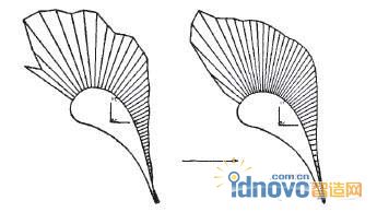 型面在截面型線方向上的光順性,主要由截面型線的質(zhì)量所決定。每個(gè)截面型線一般由內(nèi)弧、背弧、進(jìn)汽邊圓弧和出汽邊圓弧這四段曲線來構(gòu)成。內(nèi)、背弧段的數(shù)據(jù)一般為離散點(diǎn),而進(jìn)、出汽邊圓弧的數(shù)據(jù)大多由圓心和半徑數(shù)據(jù)直接給出。內(nèi)、背弧曲線在NX中可由過型值點(diǎn)的三次參數(shù)樣條曲線(spline through points)來定義。曲線在定義之初往往無(wú)法直接滿足光順性要求,需要進(jìn)行適當(dāng)?shù)木庉嬏幚怼4蜷_曲線的曲率梳(curve combs)功能,能直觀地反映曲線的光順性,并幫助去除定義數(shù)據(jù)中可能存在的“壞點(diǎn)”。結(jié)合應(yīng)用型值點(diǎn)自動(dòng)光順(smooth spline)功能及手工的微調(diào)處理,使編輯形成的曲線曲率梳平滑而沒有拐點(diǎn),同時(shí)又不超出曲線允許的擬合誤差,如圖3所示。根據(jù)筆者的經(jīng)驗(yàn),比較理想的處理方法為:先定義并調(diào)整自由端點(diǎn)矢量條件下的內(nèi)、背弧樣條曲線,然后均勻取圓弧上的數(shù)點(diǎn)用樣條線或二次曲線來表示進(jìn)、出汽邊圓弧,并控制兩端與樣條相切。這種方法不僅很好地滿足了擬合精度,而且也容易保證曲線的光順性。