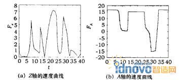 為了對(duì)等切削速度多軸螺旋銑的動(dòng)力學(xué)特性進(jìn)行分析,以下在一個(gè)典型的型面精加工四軸程序中截取一段,并在讀取各軸的位移數(shù)據(jù)后,分析了刀具在繞型面轉(zhuǎn)一周的過程中各軸的速度及加速度。從輸出的速度曲線來看,各軸的速度變化曲線各不相同,如圖6所示(僅列出Z軸與A軸的曲線,下同)。但從圖7所示的加速度曲線上看,各軸則表現(xiàn)出幾乎相同的特征:在整個(gè)時(shí)間段內(nèi)均會(huì)在同樣的三處出現(xiàn)峰值。經(jīng)與原程序?qū)Ρ群蟀l(fā)現(xiàn),分別出現(xiàn)在進(jìn)入和退出出汽邊圓弧及在內(nèi)弧段刀軸突然反向處,正好對(duì)應(yīng)于加工中極易出現(xiàn)過切等質(zhì)量問題的位置。