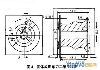 如圖1所r,A為工件4的最小半徑控制點。利用數(shù)據(jù)庫巾的前角和后角值,過最小半徑點A創(chuàng)建作圖基準面1和2,從數(shù)據(jù)庫中提取圓體成形車刀3的結(jié)構(gòu)數(shù)據(jù),然后根據(jù)最小半徑控制點的位置確定圓體成形車刀的位置。這樣即可保證圓體成形車刀的結(jié)構(gòu)尺寸標準化。