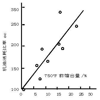 機油的性能品質對機油消耗影響,主要表現在揮發性和抗泡性。試驗表明,油的餾分范圍越輕,揮發性越大,機油的消耗也越大(如圖5)?,F代汽車由于對燃油經濟性的要求,廣泛應用低粘度多級機油,以及油溫、機體溫度過高也是造成機油揮發大、油耗增加的主要原因之一。