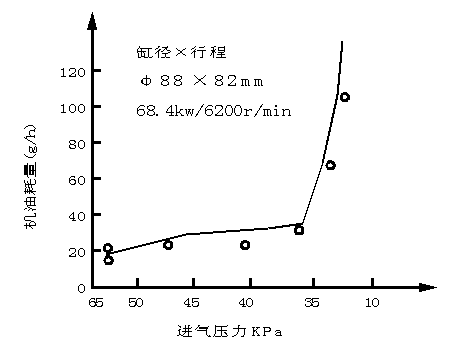 據文獻記載,在汽缸、活塞、活塞環配合副間隙正常時,引起機油上竄燃燒室的主要因素是燃燒 室負壓過大而致(低于曲軸箱內的壓力)。圖6為某四沖程六缸柴油機,進氣壓力與機油消耗量的關 系。