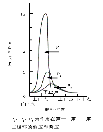 造成汽缸壁和活塞環組磨損的主要原因有:高的滑動速度和加速度(滑動速度一般為:7~16m/ s;加速度為12000~15000m/s2);柴油機負荷和較高 的燃燒壓力(使活塞環與缸壁間,活塞側面與缸套間以及環與環槽間承受很高不均衡的壓力。如圖9 所示);機油粘度、汽缸壁溫度以及燃料的品質等。尤其是汽缸上部、第一道壓縮環及活塞環壁,因潤滑條件惡劣,再加上受到爆發沖程高溫高壓氣流的沖擊,以及使用操作不當等因素的影響,約有40% 左右的柴油機在磨合運轉期間,均發現有不同程度的異常磨損現象。 #p#分頁標題#e#