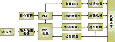 數控(Numerical Control)是數控技術的簡稱。它是利用數字化的信息對機床及加工過程進行控制的一種方法。數控系統是數控機床的重要部分,它隨著計算機技術的發展而發展?,F在的數控系統都是由計算機完成以前硬件數控所做的工作,為特別強調,有時也稱為計算機數字控制系統。計算機數字控制CNC(Computer Numerical Control)系統是以微處理器技術為特征,并隨著電子技術、計算機技術、數控技術、通訊技術以及精密測量技術的發展而不斷發展完善的一種先進加工制造系統。CNC系統框圖見圖1所示,它由數控程序、輸入輸出設備、操作面板、CNC裝備、可編程控制器(PLC)、主軸伺服系統、進給伺服系統、檢測裝備和一些電氣輔助裝置等組成。